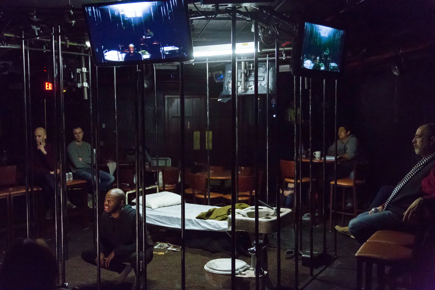 "The audience is seated so as to surround a prison cell which has been placed in the middle of the Cabaret’s small venue, and its members are forced into the uncomfortable position of watching Fowler through bars, illumination coming from two harsh, white lights. Dramatic tension is built into the set: how will the audience penetrate the cell? How will Fowler’s character, Dae Brown, escape it?" Jacob Potash Yale Daily News